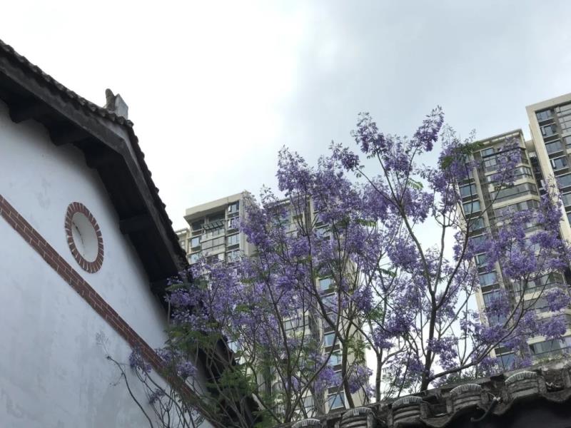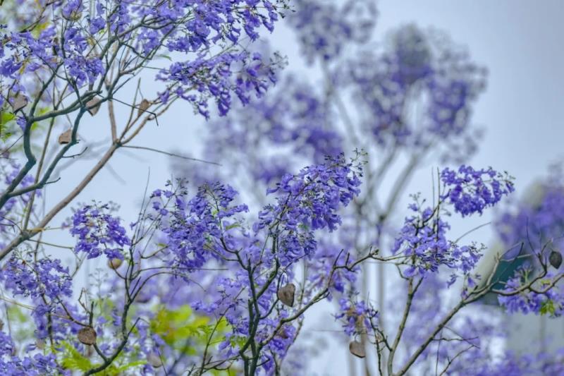 相見,總在不經(jīng)意間。 于一片灌木中,于建筑物的墻邊, 藍花楹撐開手中傘,投落道道暗香悠遠(yuǎn)。